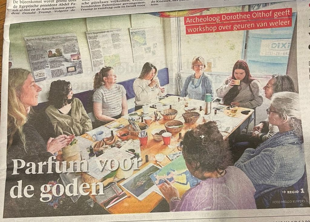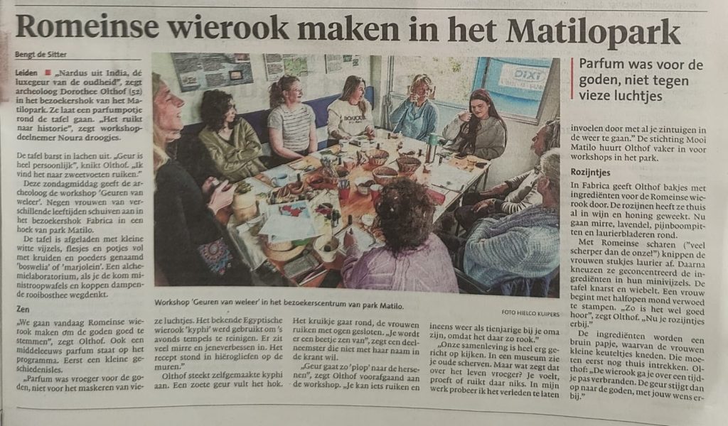 Het was een leuke verrassing dat een journalist en fotograaf van het AD aanwezig waren tijdens de workshop Geuren van Weleer, op zondagmiddag 12 oktober jl. Archeoloog en workshopleider Dorothee