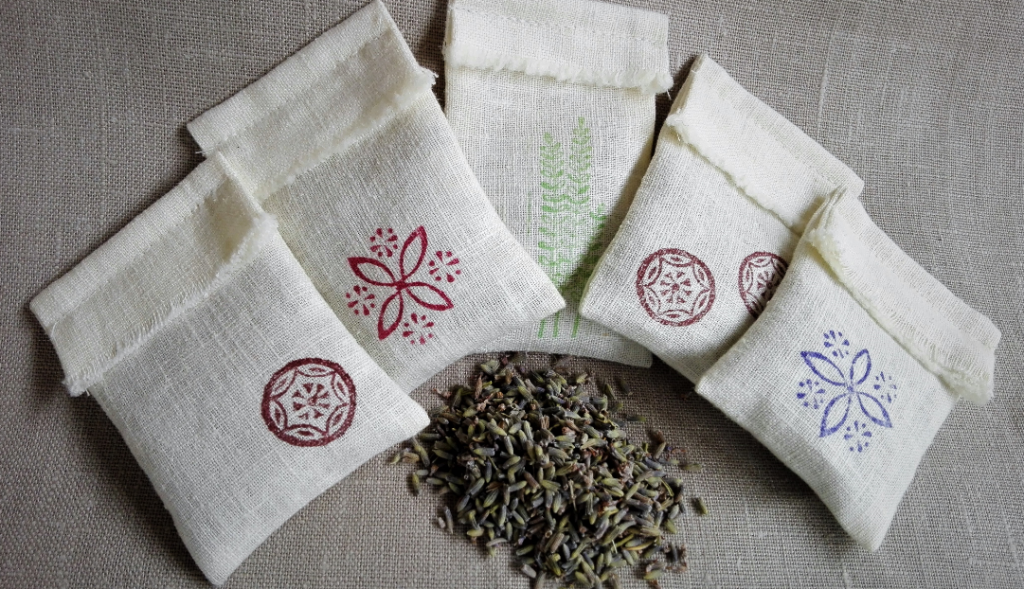 Heerlijke lavendelzakjes. Een linnen zakje vol gedroogde bloempjes met prachtige stempels versierd. Prijs per geurzakje: € 3,50