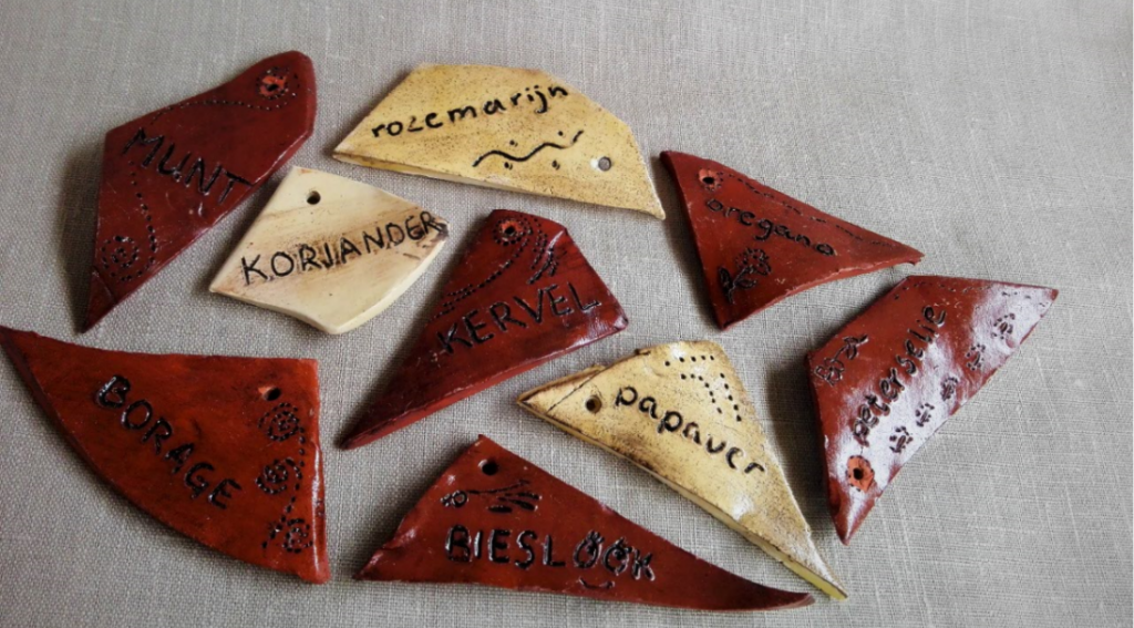 In de tuinen gebruiken we zelfgemaakte ‘naamscherven’ als plantenlabels, zodat onze bezoekers (en wijzelf) weten wat er allemaal groeit. We hebben extra scherven gemaakt, zodat jullie je planten ook in archeologische sferen kunnen labelen! Je kan ze bevestigen aan een houten of metalen pin. Prijs per naambordje (zonder stok): € 2,50
