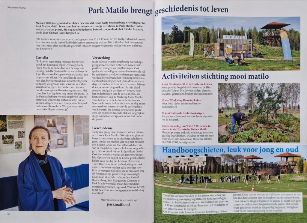 Nelly Spanjersberg is een van de enthousiaste vrijwilligers van stichting Mooi Matilo. Zij vertelt niet alleen graag het Romeinse verhaal van fort Matilo (Unesco Werelderfgoed per slotte) maar ook over de perioden daarna. Regelmatig is ze op zondagmiddag aanwezig als rondleider/verhalenverteller. Ze weet trouwens ook veel over de Romeinse keuken…..